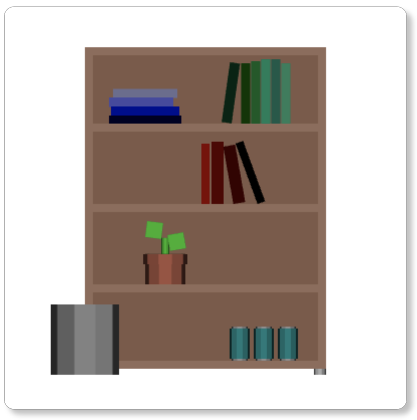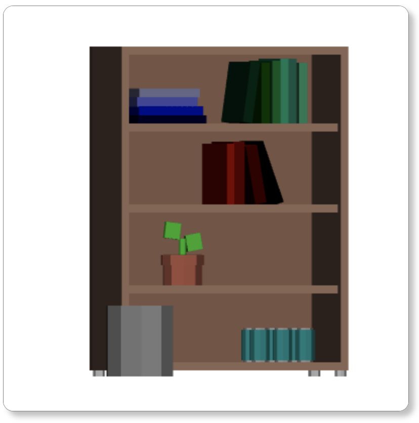 Shown above is the scene made using manipulated cylinders and cubes, which was created last lab. As seen, the bookshelf can be rotated around both the x and y axis. In this case, the scene is rotated a small amount around the y axis.